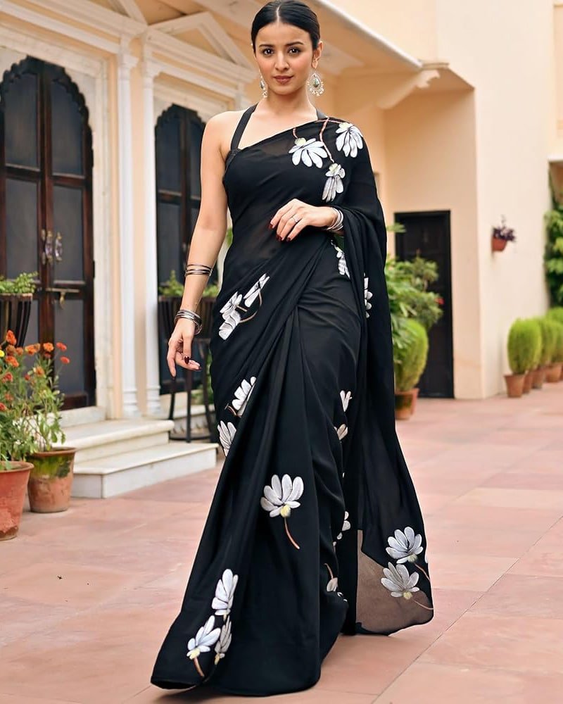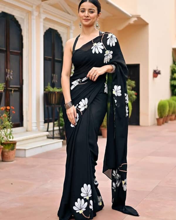 The saree features a classic black base enhanced with hand-printed designs, giving it a modern yet traditional appeal. Black has always been a symbol of grace, and when combined with the subtle touch of semi moslin fabric, it creates a magical look that is both refined and captivating.